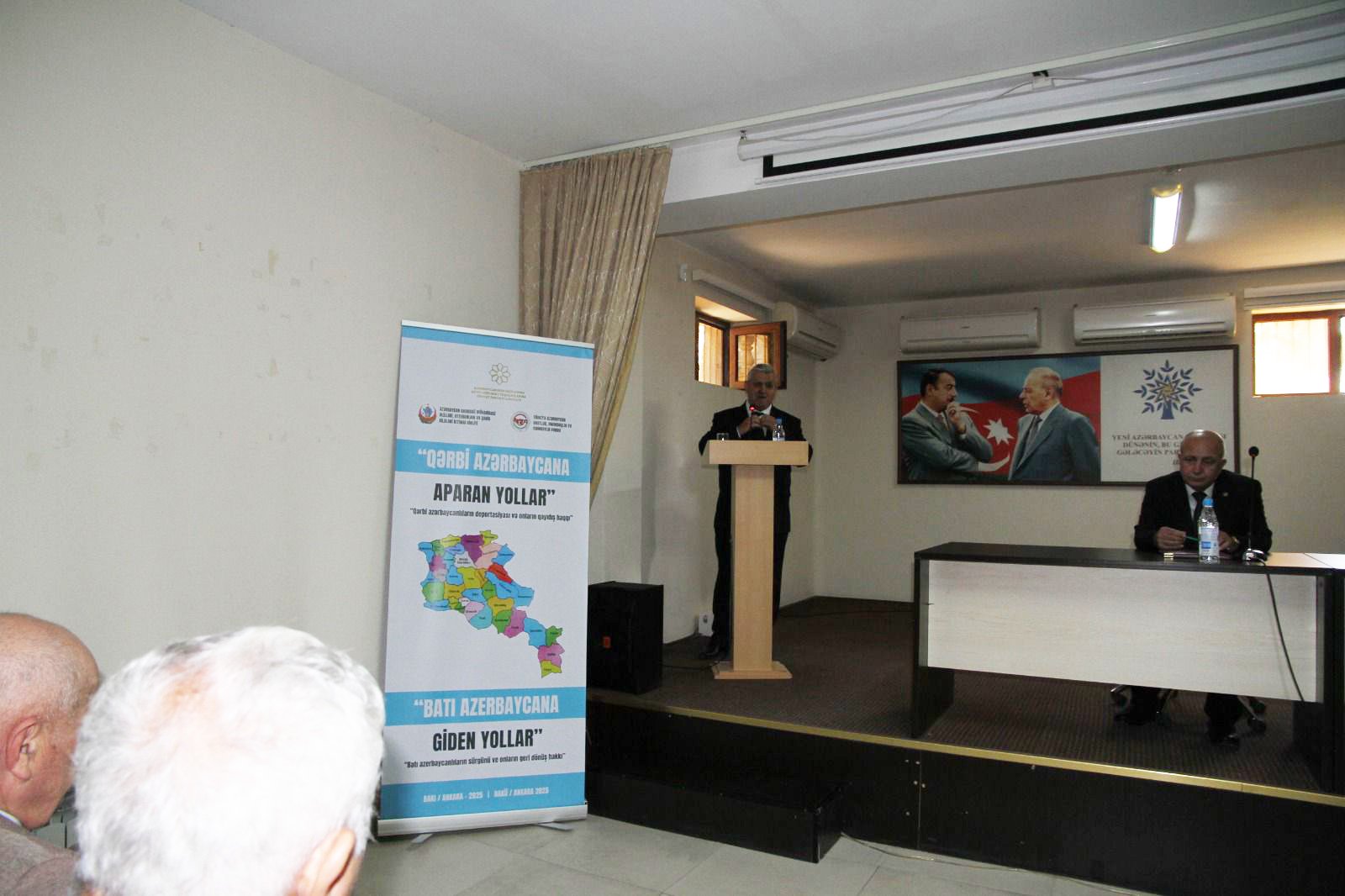 Tədbirdə şəhidlərimizin əziz xatirəsi 1 dəqiqəlik sükutla yad edildi. Daha sonra layihənin rəhbəri Mehdi Mehdiyev çıxış etdi. O, öz çıxışında tədbirə gəlmiş qonaqları və tədbir iştirakçılarını salamladı və iştirak üçün öz minnətdarlığını bildirdi. Sonra o, Qərbi Azərbaycandan məcburi deportasiyaya məruz qalmış soydaşlarımızın öz doğma ata yurdlarına qayıtmalarının vacibliyindən danışdı və bu məsələni beynəlxalq aləmdə hüquqi prizmalara arxalanaraq həyata keçirməyin vacibliyini bildirdi. YAP Səbail rayon təşkilatının sədri Muxtar Nağıyevə söz verildi. Çıxışında o, Azərbaycanın müstəqilliyinin təhlükə altında olması zamanı xalqın təkidi ilə Ulu Öndərimiz ikinci dəfə hakimiyyətə gətirildi. Hakimiyyət gəldikdən sonra ordu quruculuğuna, ölkəmizin mövcudluğuna görə iqtisadiyyatımızın inkişafına görə addım atmağa başladı. Belə ki, “Əsrin mqaviləsi” bağlandı. Azərbaycanın iqtisadiyyatı inkişaf etməklə yanaşı ordu quruculuğuna böyük rol verildi. 2003-cü ildə Ulu Öndərimizin səhhəti ilə bağlı prezident seçkilərində namizədliyini geri götürərək YAP tərəfindən İlham Əliyevin namizədliyi irəli sürüldü və həmin seçkilərdə 77,7% ilə prezident seçildi. Ulu Öndərimizin davamçısı İlham Əliyev ordu quruculuğuna önəm verərək Qafqazda ən güclü ordu yaratdı. Bunun nəticəsi olaraq işğal altında olan 20% torpaqlarımız işğaldan azad edildi və bu gün Azərbaycan Zəngəzur dəhlizinin azad olunması uğrunda hüquqi müstəvidə mübarizə aparır. Daha sonra “Qərbi Azərbaycana aparana yollar” adlı kitabı təqdim etmək üçün müəllif, professor, t.ü.e.d. Şikar Qasımova söz verildi. O çıxışında mövzunun aktuallığından o cümlədən türkdilli dövlətlər arasında bu məsələni təbliğ edilməsinin vacibliyindən danışdı. Kitabın gələcəkdə nəşrinin çoxaldılmasına ehtiyac olduğunu vurğuladı. Sonradan mövzu üzrə müzakirələr başladı. Çıxış edənlər bu mövzunun işıqlandırılmasında əməyi olan hər bir kəsə öz minnətdarlıqlarını bildirdilər. Layihə üzrə tərəfdaş Türkiyə-Azərbaycan Dosluq İşbirliyi Vəqfinin (TADİF) icraçı direktoru Əvəz Səfərov öz çıxışında hər iki təşkilat arasında dostluq, tərəfdaşlıq olmasından, bundan sonra da bu istiqamətdə birgə layihələr həyata keçirəcəklərindən danışdı. O cümlədən, TADİV-in başkanı Aygün xanımın salamlarını çatdırdı və bu günkü tədbirə üzrlü səbəbdən gələ bilməməsini vurğuladı. Tədbirin əsas məqsədi Qərbi azərbaycanlıların tarixi taleyi, deportasiya proseslərinin ictimai-siyasi nəticələri və onların doğma yurdlarına qayıdış hüququnun beynəlxalq-hüquqi aspektlərinin müzakirə edilməsidir. Bu müzakirələr, Qərbi Azərbaycan mövzusunda ictimai şüurun artırılması və milli yaddaşın qorunmasına xidmət edəcək.