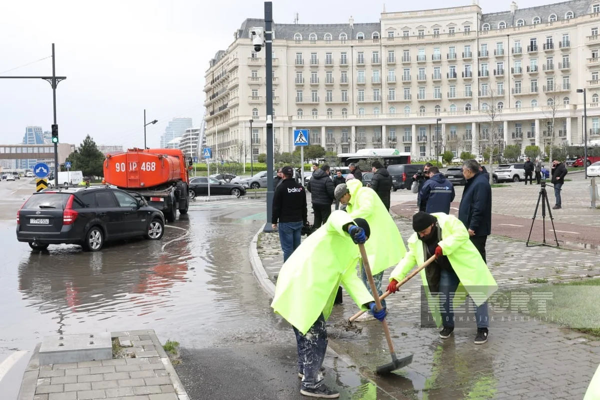 İntensiv yağan yağışın törətdiyi fəsadları aradan qaldırmaq üçün Bakı şəhərinin bütün məsul qurumları koordinasiyalı şəkildə işləyirlər.